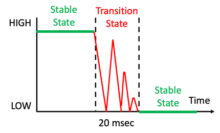 在运行上面的代码时,你可能已经注意到,按下按钮后 LED 存在闪烁的现象,这是为什么?是代码的错误吗?这是因为按钮并不是一个完美的开关,由于机械触点的弹性作用,一个按键开关在闭合时不会马上稳定地接通,在断开时也不会一下子断开,因而在闭合及断开的瞬间均伴随有一连串的“抖动”。信号从稳定状态移动,经过不稳定的过渡状态,最终到达新的稳定状态,如下图所示。