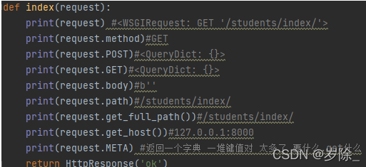 HttpRequest.META:一个标准的Python 字典,包含所有的HTTP 首部。具体的头部信息取决于客户端和服务器简单访问下,在地址栏输入127.0.0.1:8000/students/index (get请求)