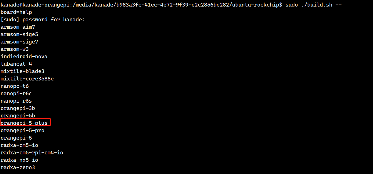 比如我想看香橙派5plus的设备名称是啥,可以使用sudo ./build.sh --board=help