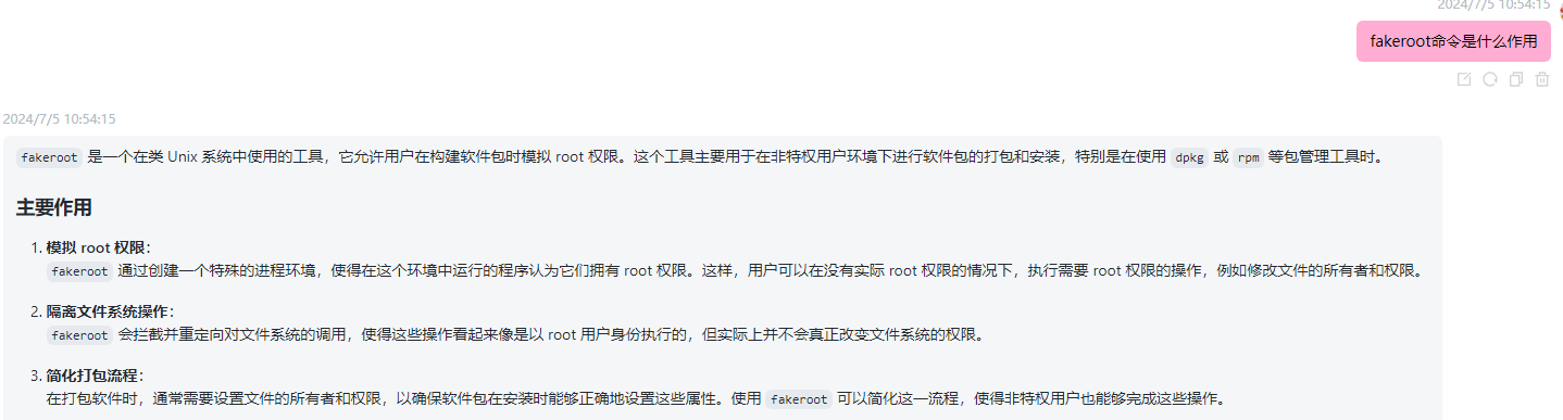 fakeroot的解释,可以简单理解为沙盒下的sudo: