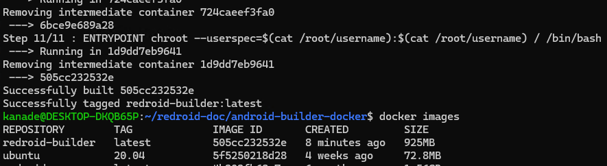 然后开始构建docker镜像: docker build --build-arg userid=$(id -u) --build-arg groupid=$(id -g) --build-arg username=$(id -un) -t redroid-builder .