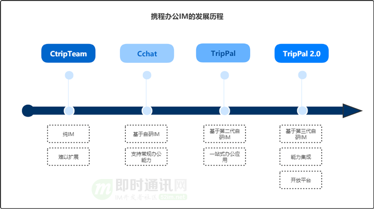 携程内部的办公IM项目最早在2016年立项,经历了初期简单办公场景下的纯IM服务,到支持简单办公组件的IM应用,又演变为一体化办公集成平台,进而演变为目前集成IM功能的开放式企业效率平台。