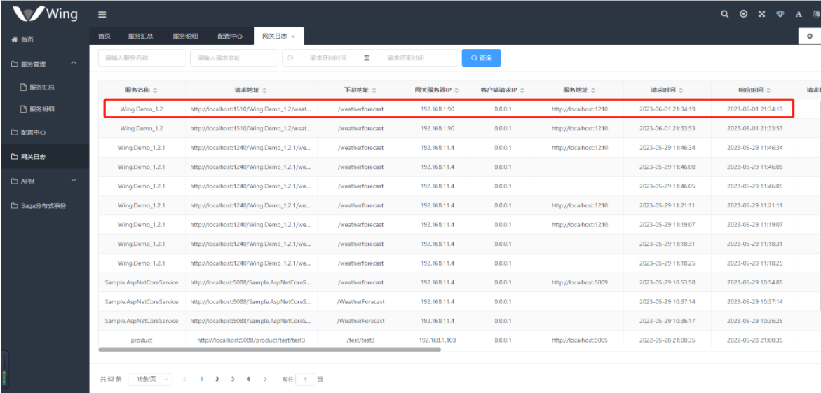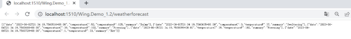 请求服务地址默认是{网关IP或域名}/{服务名}/{服务路由},例如:http://localhost:1510/Wing.Demo_1.2/weatherforecast