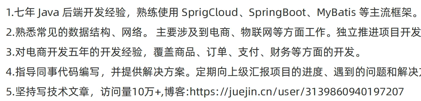 然后介绍自己的项目经历,自己负责的模块,如何实现对应的技术模块。印象比较的深一个点,是自己写博客地址,就问了下是不是自己写的,说看了还是写的挺不错的。而且还说:我最近几天面试了十多个人,你是唯一一个让我感觉挺满意,背八股文不是应付任务一样的背,还会结合一些实际的工作常见使用。做项目也有自己的想法,而且还会把自己的心得、总结写成博客。当时就感觉自己写了这么久的博客有人表扬还是很开心的。