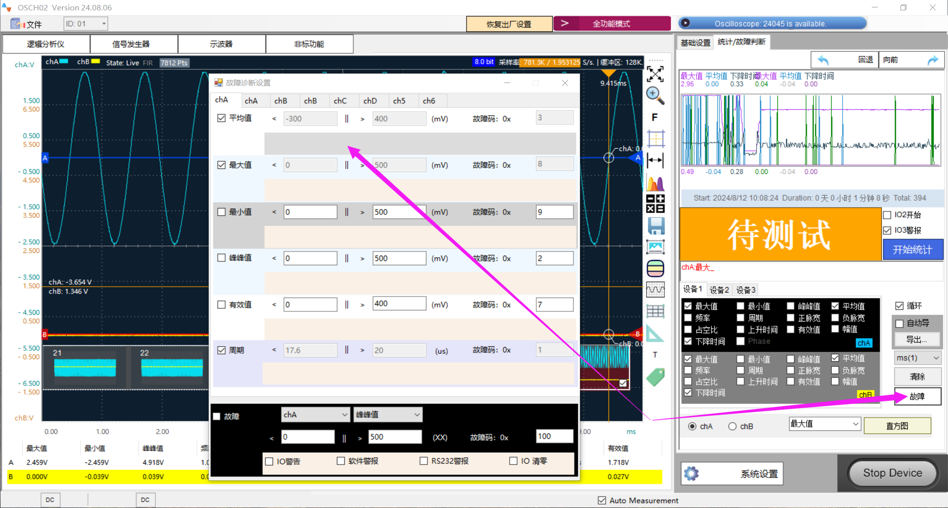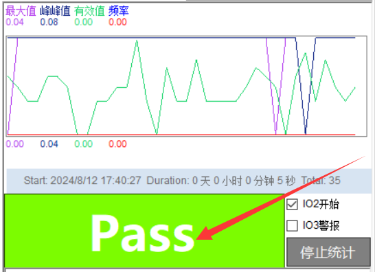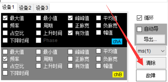 “开始统计”被点击或者触发后,会清零之前的统计曲线波形和相关的数据,如果开启了故障pass/fail测试,也会清零故障信息。