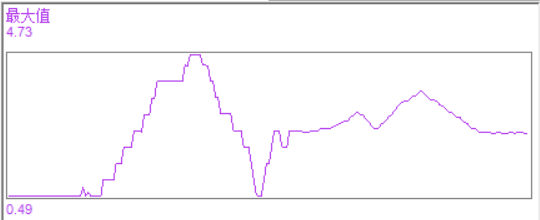 在信号检测的自动化测量中,大部分时间是关心某个测量值随时间变化的趋势,比如在开机检测后,波形的峰峰值是如何变化的。虚拟示波器的统计曲线功能,可以绘制出你关注的某些测量值的变化趋势曲线,如下图所示,示波器测试的信号最大值随着时间变化,从最低的0.49V逐渐变高,一直到4.73V,然后又降低到最低,接着缓缓升高并震荡: