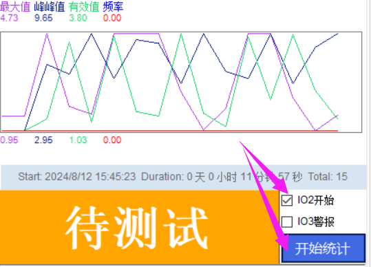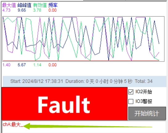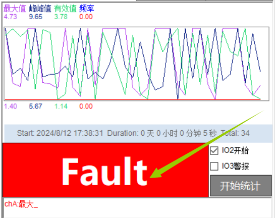 统计曲线的历史数据和波形,以及故障分析的结果等,都可以通过点击按钮“清除”进行清空。清空后波形和数据将清零,如果勾选了IO3警报的话,那么IO3的输出状态也会被清除。除了手动点击这个清除之外,“停止统计”后的点击“开始统计”时,也会对统计和故障信息自动清除,如果勾选了“IO2开始”,那么从停止到开始的IO状态切换,也会对统计和故障信息自动清除。