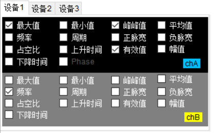 理论上所有测量值,比如“最大值,最小值,峰峰值,有效值,平均值,频率,周期,占空比,正负脉宽,上升时间,下降时间”等等,都可以进行统计曲线的绘制,监测它们的变化趋势曲线。但是 虚拟示波器软件的标准版并没有开放所有这些测量值的统计曲线功能,根据型号不同和客户定制的情况不同,只开放了部分测量值的统计曲线功能。这些可以在统计曲线的配置页面看到。有些示波器型号支持多台级联的情况下,多台设备多通道的测量值的统计曲线绘制: