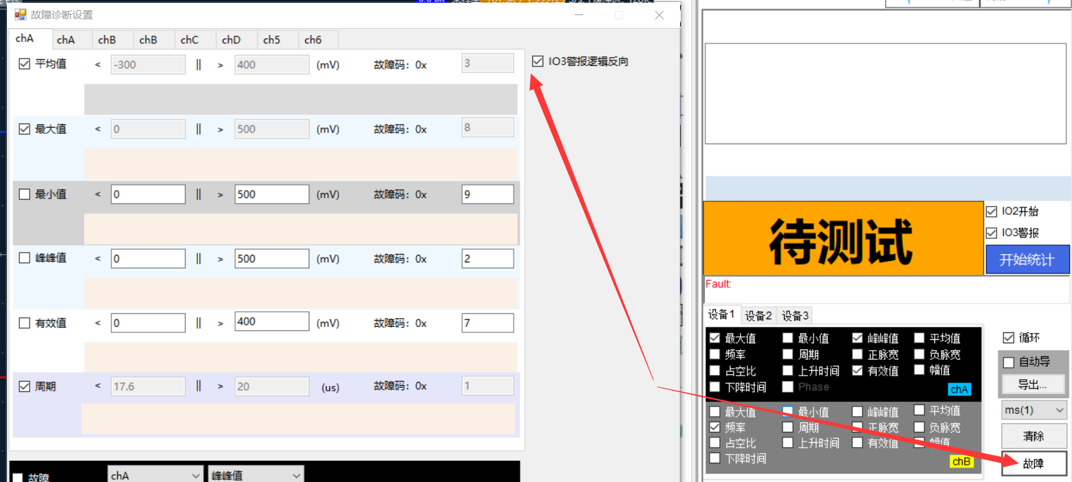 默认的情况下,如果是PASS状态,那么IO3输出低电平,如果是fail状态,那么IO3将输出高电平。如果需要的是相反的逻辑,那么可以在故障的设置页面勾选“IO3警报逻辑反向”选项: