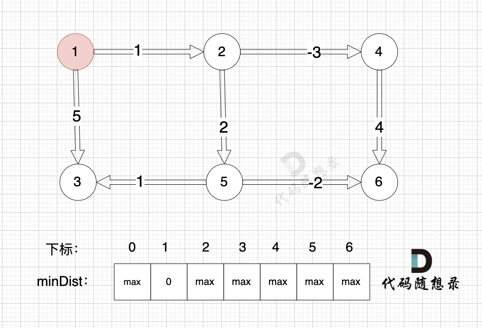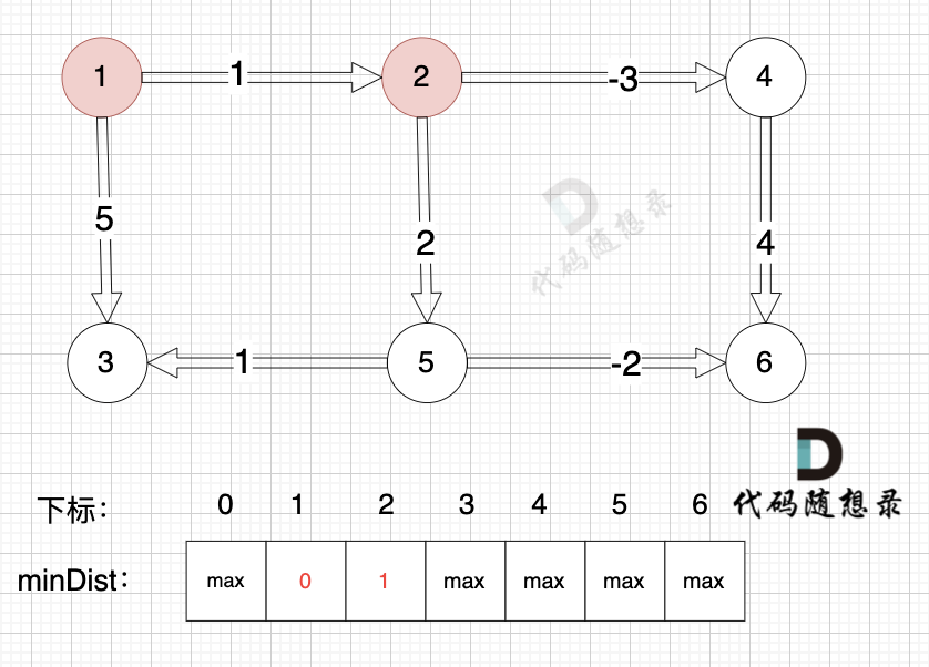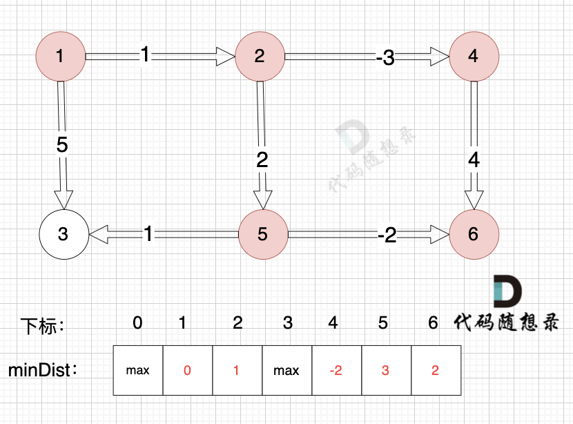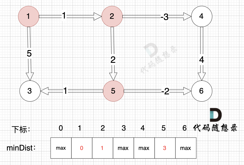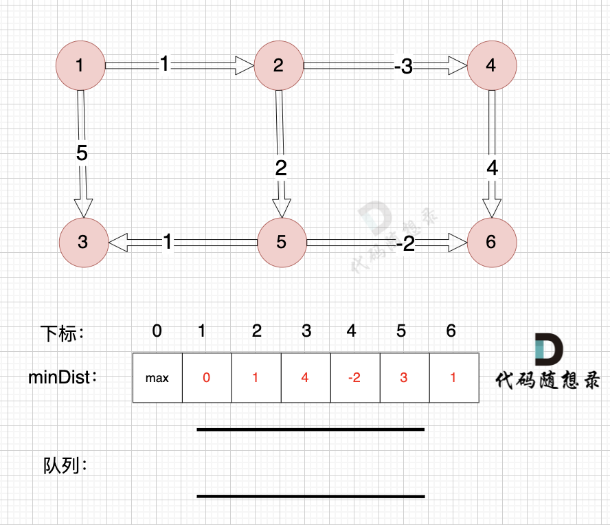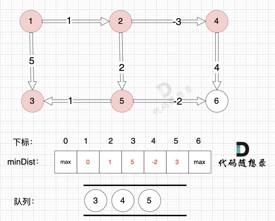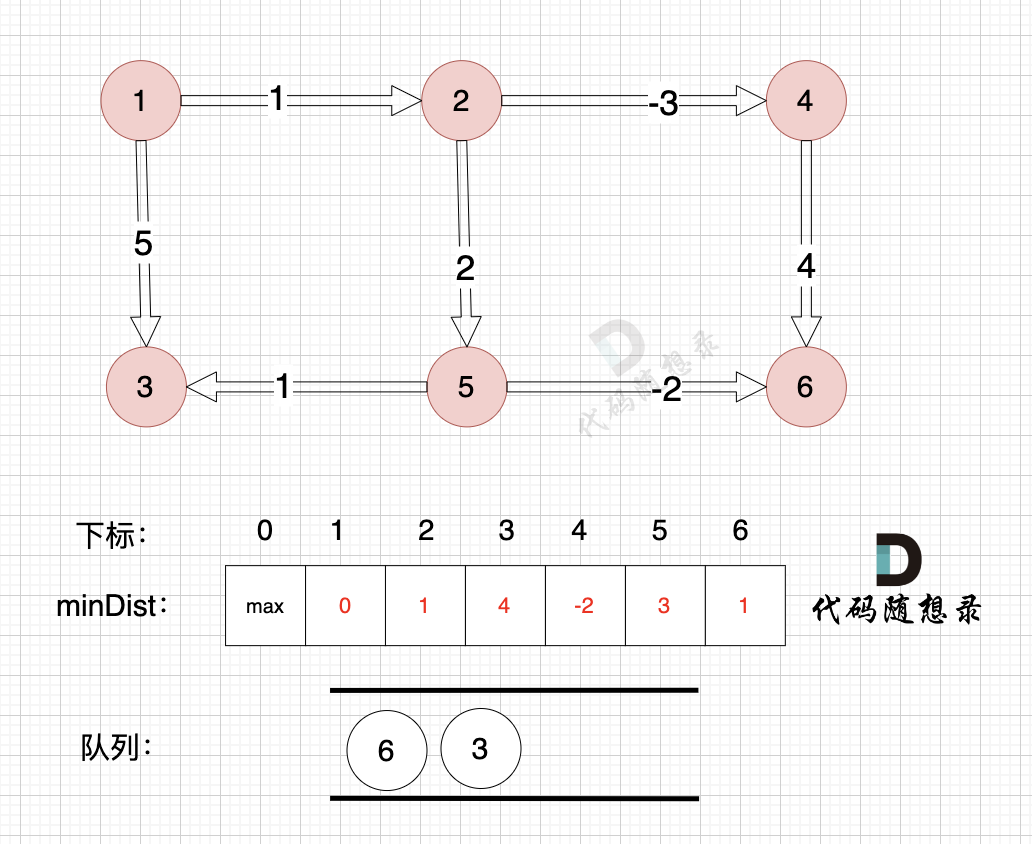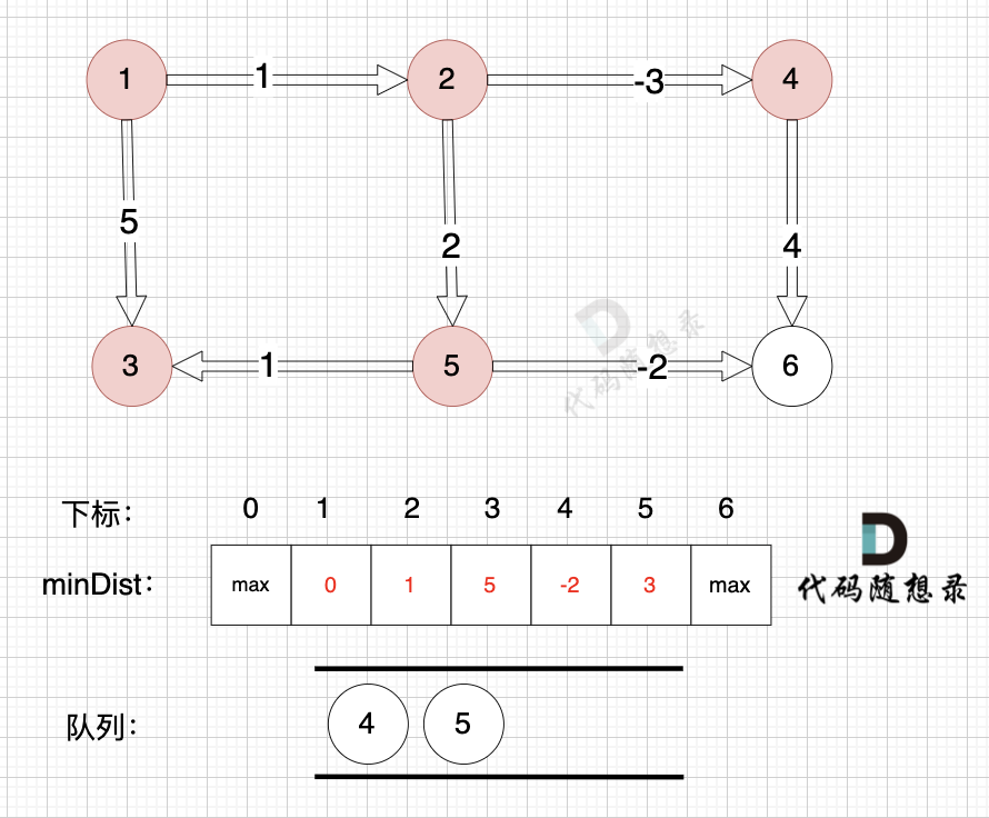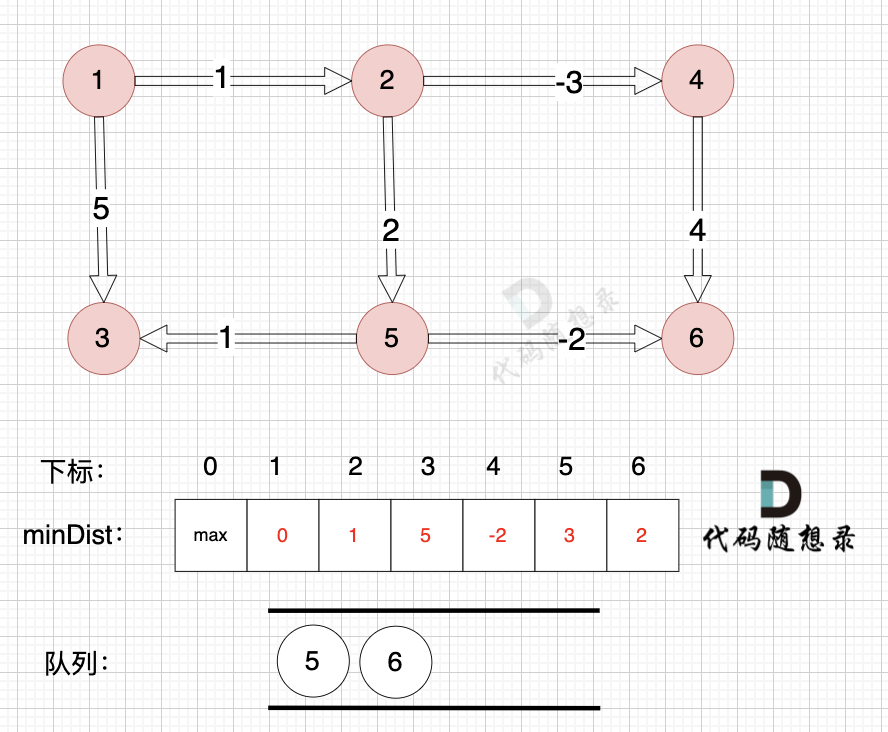 - 从队列中取出节点5,以节点5为起点,压入与其有边的节点6和节点3(因为节点6还在队列中,因此不用重复压入),并更新minDist数组。