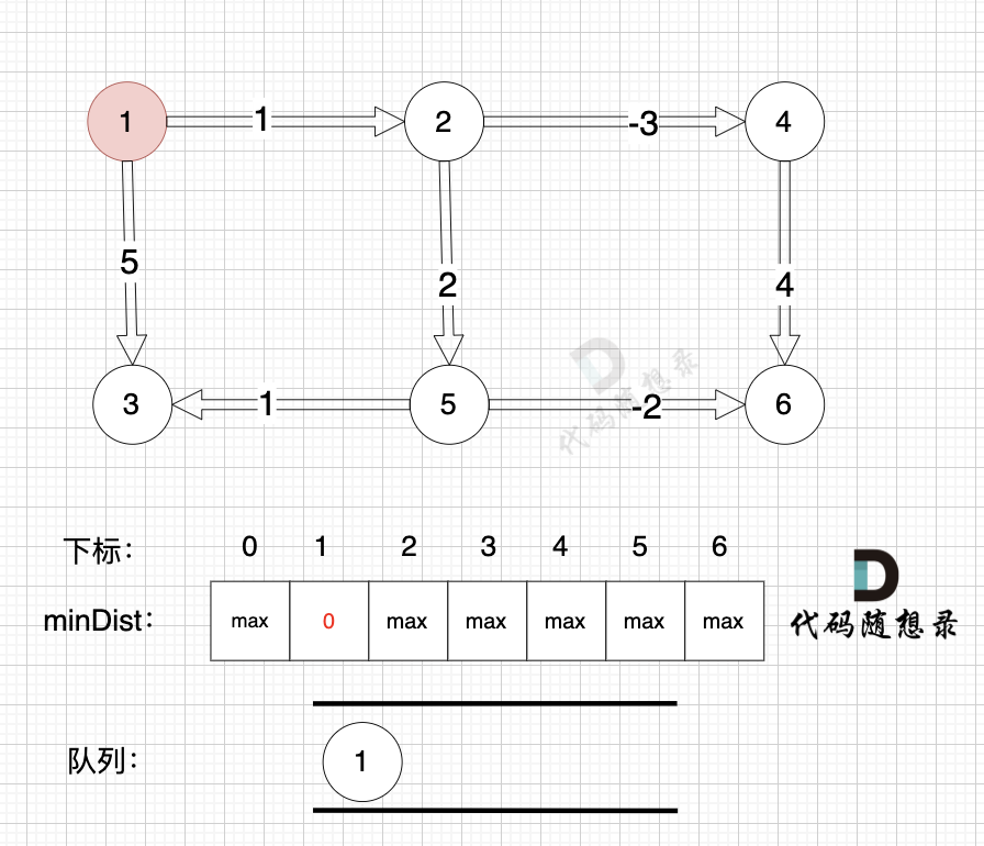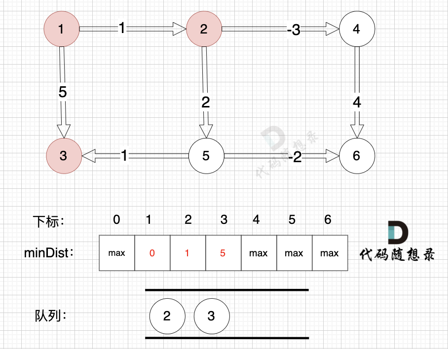 - 从队列中取出节点1,以节点1为起点,压入与其有边的节点2和节点3,并更新minDist数组。