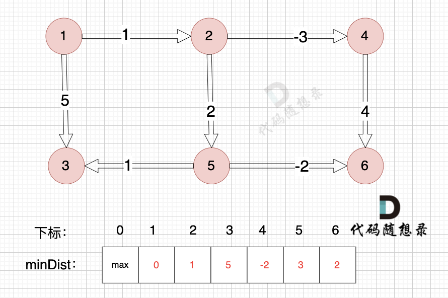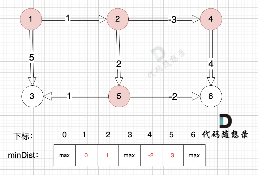 节点2到节点4:minDist[4] > minDist[2] + (-3),因此更新minDist[4]。
