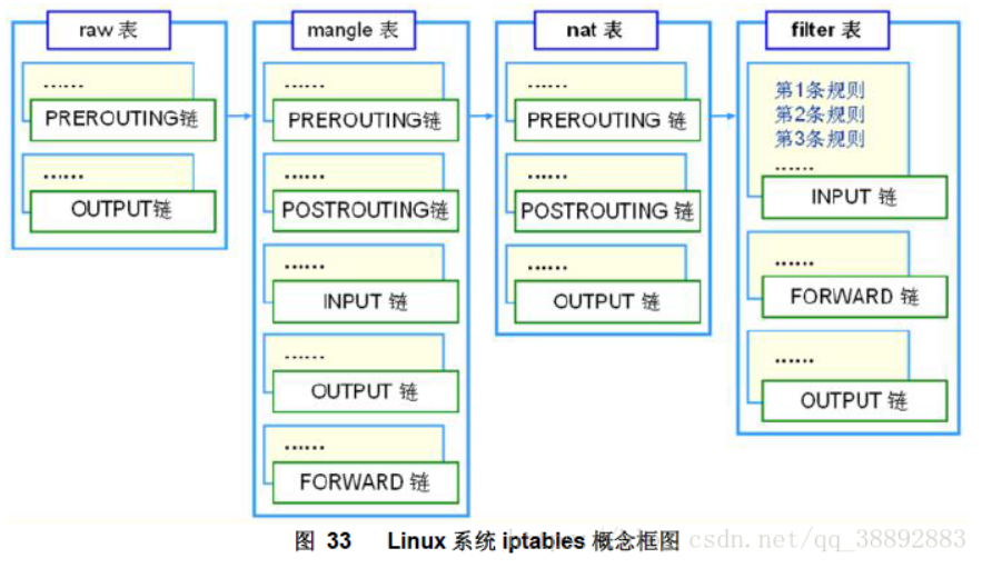 iptables中的第一个选项可以是-A, 表明向链(chain)中添加一条新的规则,也可以是-I,表明将新的规则插入到规则集的开头。接下来的参数指定了链。