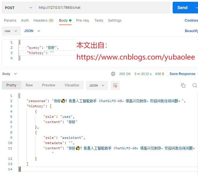 (图5) ChatGLM会输出类似“你好!我是人工智能助手ChatGLM3-6B,很高兴见到你,欢迎问我任何问题。”这样的回答。当然,就像文章开始说的结果不确定,你的结果和上面不一定相同。 视频我剪辑过,在我的电脑上,实际运行时间5分钟左右。至此最简单的模型应用开发完毕。