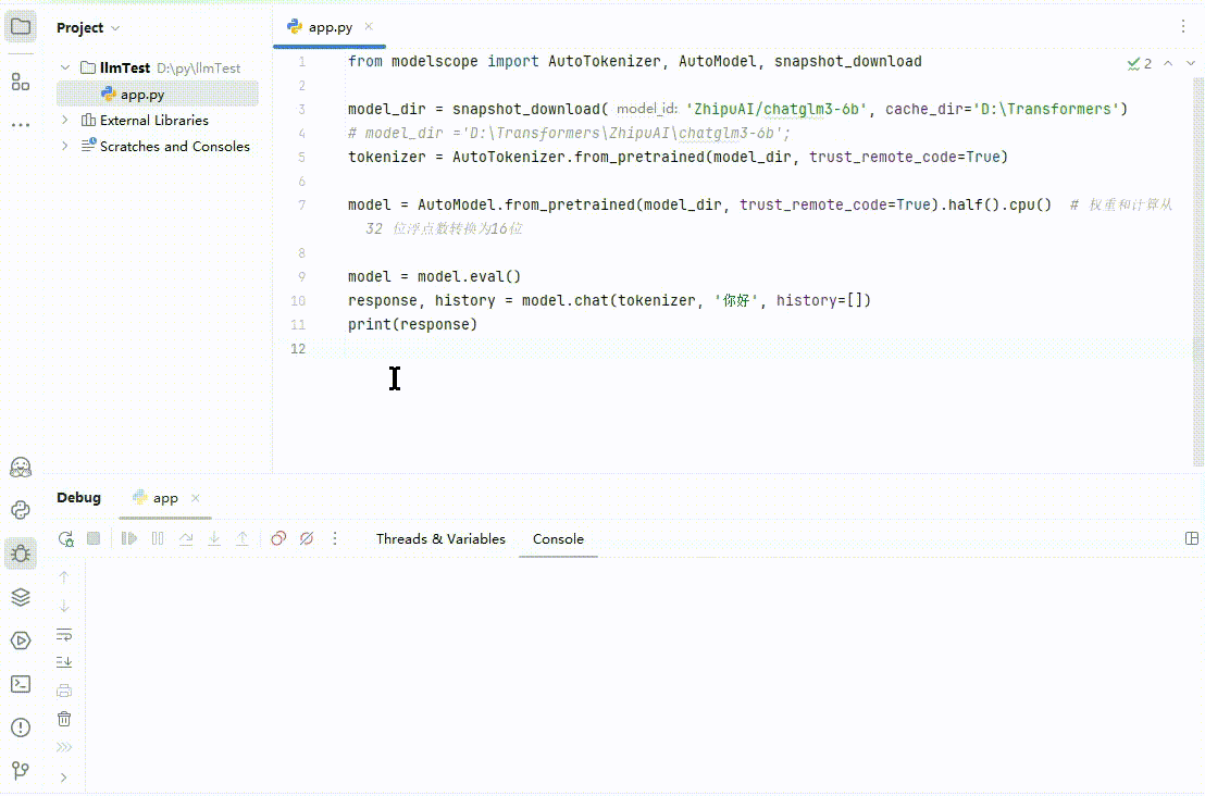 (图2) 注意图上红框的部分。这里没有用windows的命令终端执行,就是保证一直用的是我们刚刚创建的conda环境llmTest。防止安装包的时候,装到其他找不到的位置了。也可以看出下载的源用的是我们刚刚设置的清华镜像。 新建一个app.py。编写下载代码: