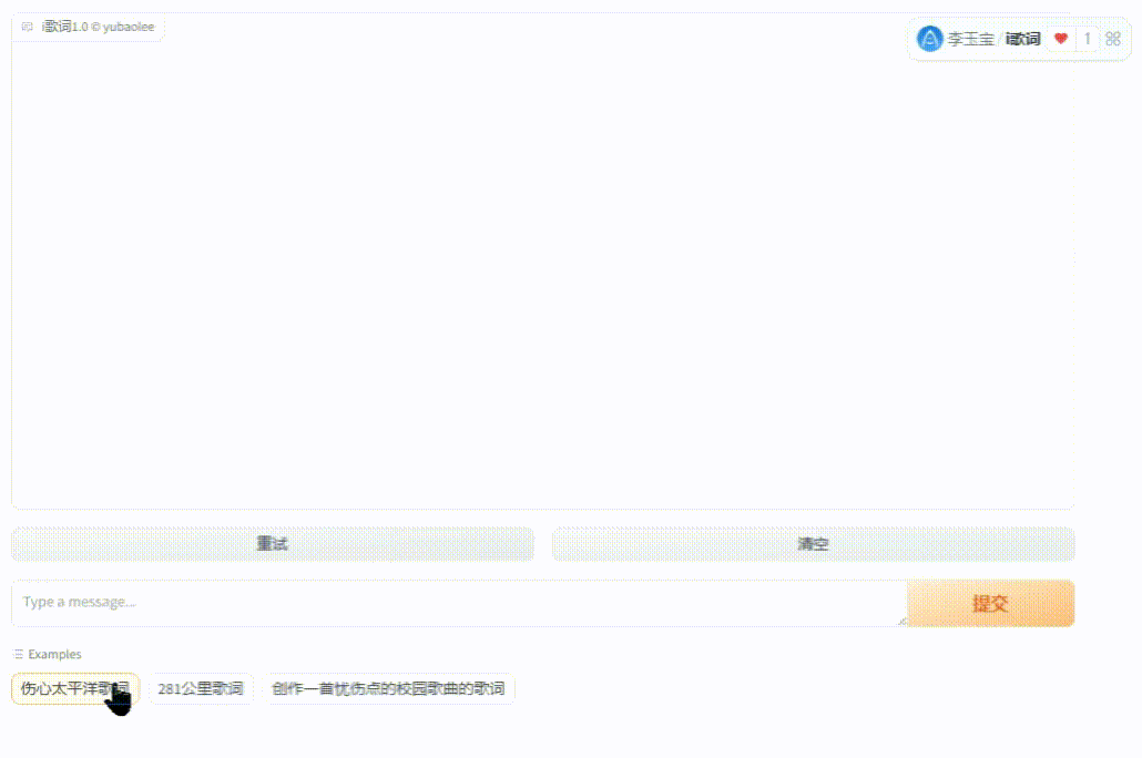 经过无数的蹂躏,我开发了个小应用【i歌词】,无任何条件免费提供全部源码。它基于chatglm4-9b大模型,从部署到训练,通用对话功能,核心根据歌名查歌词并创作歌词!用它来参加gitee AI创新应用大赛,可以在线体验,方便的话投个小票: https://ai.gitee.com/events/iluvatar-ai-app-contest/detail?app=36