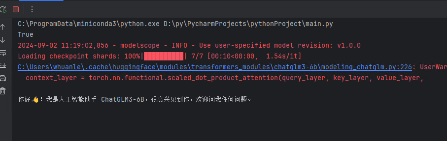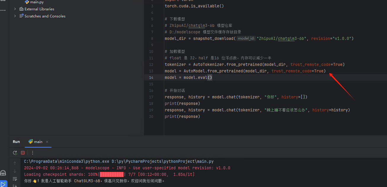 将以下代码贴到 main.py,然后运行代码,会自动下载模型、加载模型和对话。