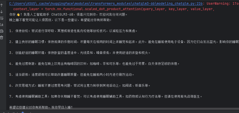 response, history = model.chat(tokenizer, "晚上睡不着应该怎么办", history=history)