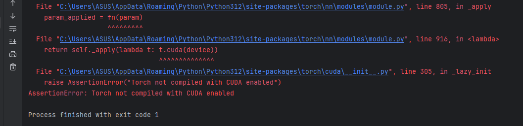 如果出现以下报错,可能安装的是 CPU 而不是 GPU 版本的 PyTorch。
