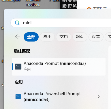 下载完成后,搜索 miniconda3 快捷菜单,以管理员身份运行,点击可以打开控制台,菜单列表会有 cmd 和 powershell 两个快捷链接,建议使用 powershell 入口。