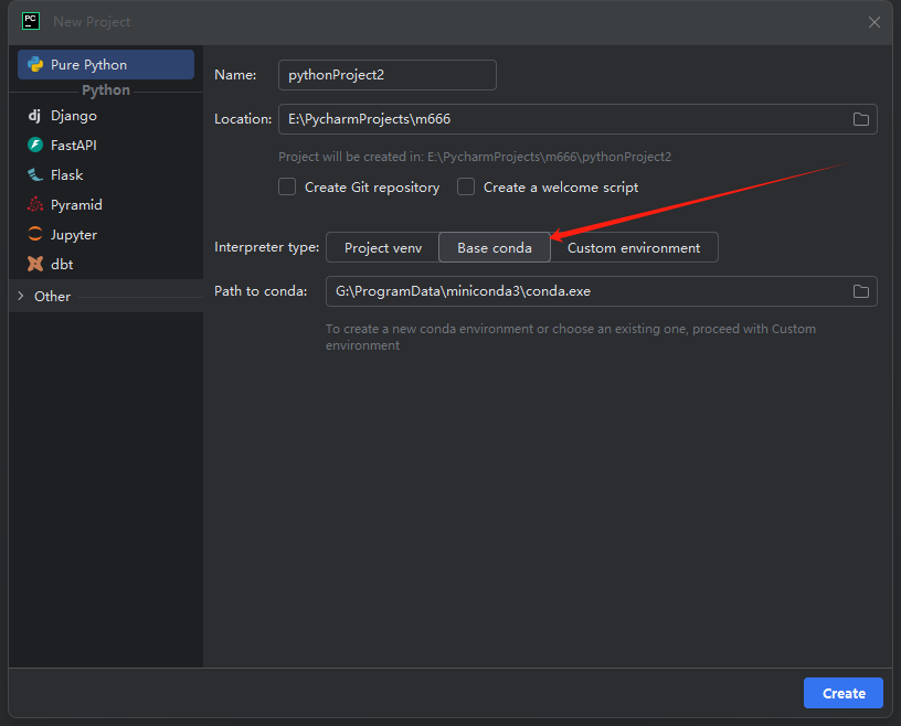 然后创建一个项目,在项目中选择基于 conda 的环境。