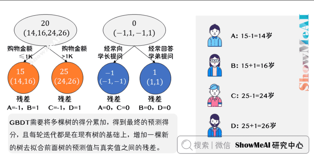 - 我们把这棵树的预测值累加到第一棵树上的预测结果上,就能得到真实年龄,这个简单例子中每个人都完美匹配,得到了真实的预测值。