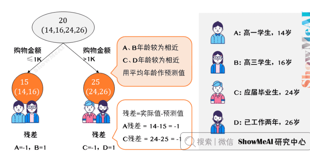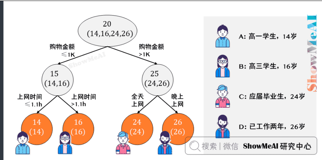 上图中的树很好理解:\(A,B\) 年龄较为相近,\(C,D\) 年龄较为相近,被分为左右两支,每支用平均年龄作为预测值。