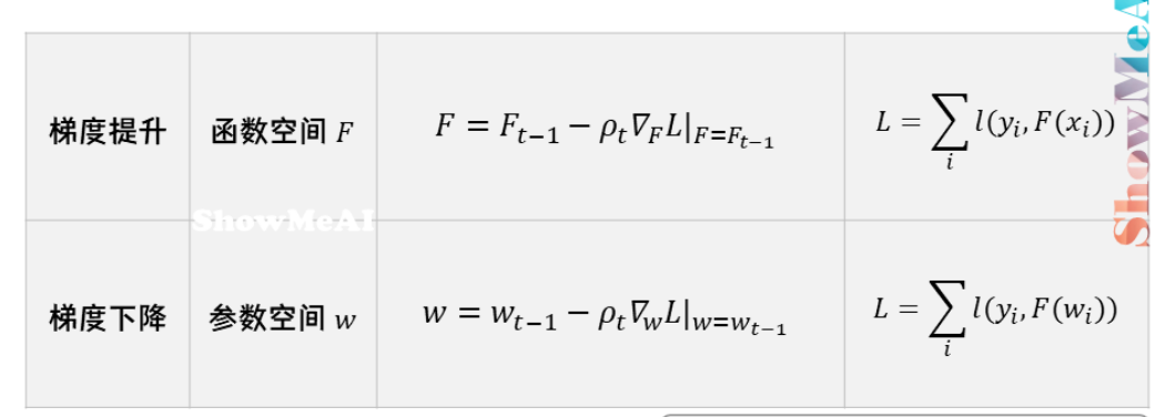 下面我们来对比一下「梯度提升」与「梯度下降」。这两种迭代优化算法,都是在每1轮迭代中,利用损失函数负梯度方向的信息,更新当前模型,只不过: