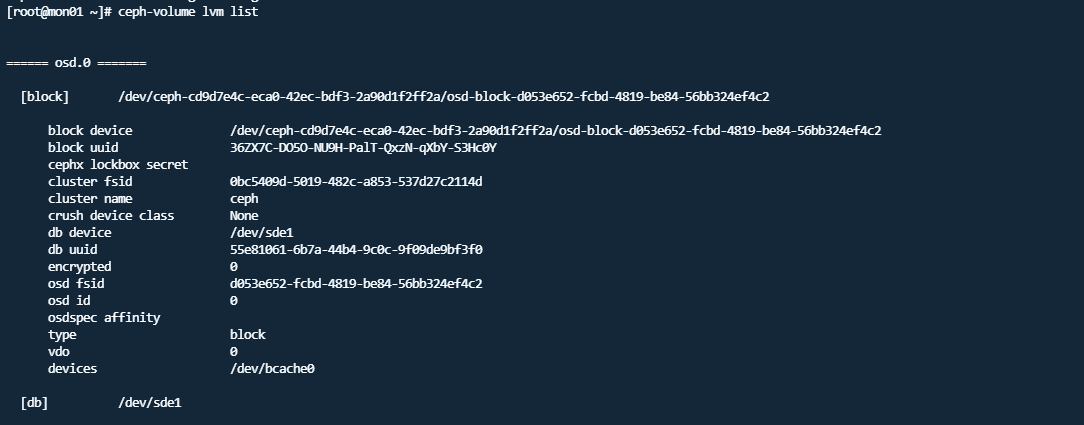 此时的–data 指定了数据盘为bcache0 、bcache1、bcache2,sde盘的分区1、2、3 则对应了block.db 。