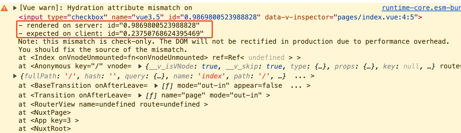这种情况是避免不了会出现前面useId例子中的那种警告,此时我们可以使用data-allow-mismatch属性来干掉警告,代码如下: