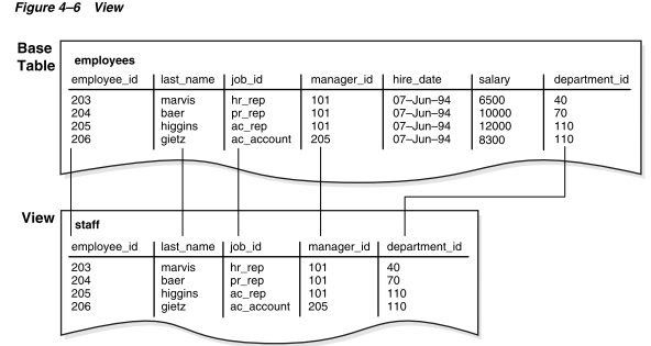 例如,图4-6显示了staff视图不显示基表employees的salary或commission_pct列。