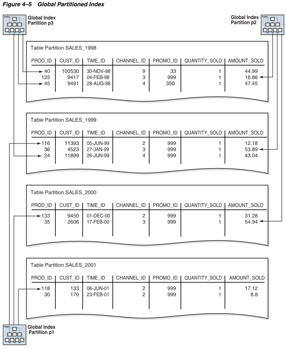 如图4-5所示,全局索引分区可以包含指向多个表分区的条目。索引分区p1指向具有channel_id为2的行,索引分区p2指向具有channel_id为3的行,索引分区p3指向具有channel_id为4或9的行。