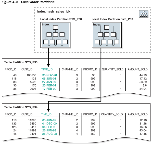 在图4-4中,hash_products表有两个分区,因此hash_sales_idx索引也有两个分区。每个索引分区与不同的表分区相关联。索引分区SYS_P38索引表分区SYS_P33中的行,而索引分区SYS_P39索引表分区SYS_P34中的行。