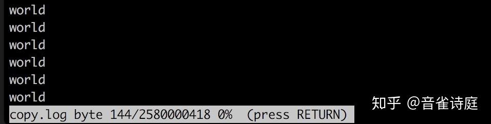 但是使用上述命令的坏处是,默认打开的位置在第一行,并且当切换到实时滚动模式(按 F ,实现效果类似 tail -f 效果 )或者想要滚动到最底部的时候(按 G ),会卡在计算行数一段时间。如果卡的时间比较长的话,可以直接按 Ctrl + c ,取消计算行数。 我更推荐打开文件的时候使用 -n :不计算行号(打开大文件的时候很有用)。