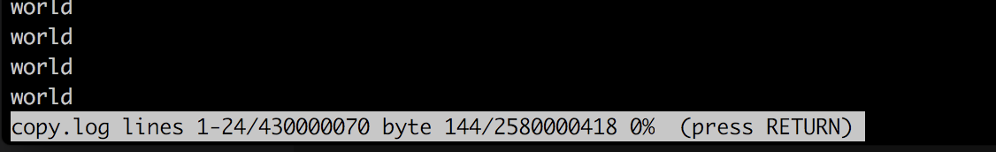 显示内容为: 文件名 copy.log , 当前屏幕显示1-24行/该文件一共有430000070行 , 从第一行到当前位置一共有 144 byte/该文件一共有2580000418 byte , 当前位置在文件的 0% 处。