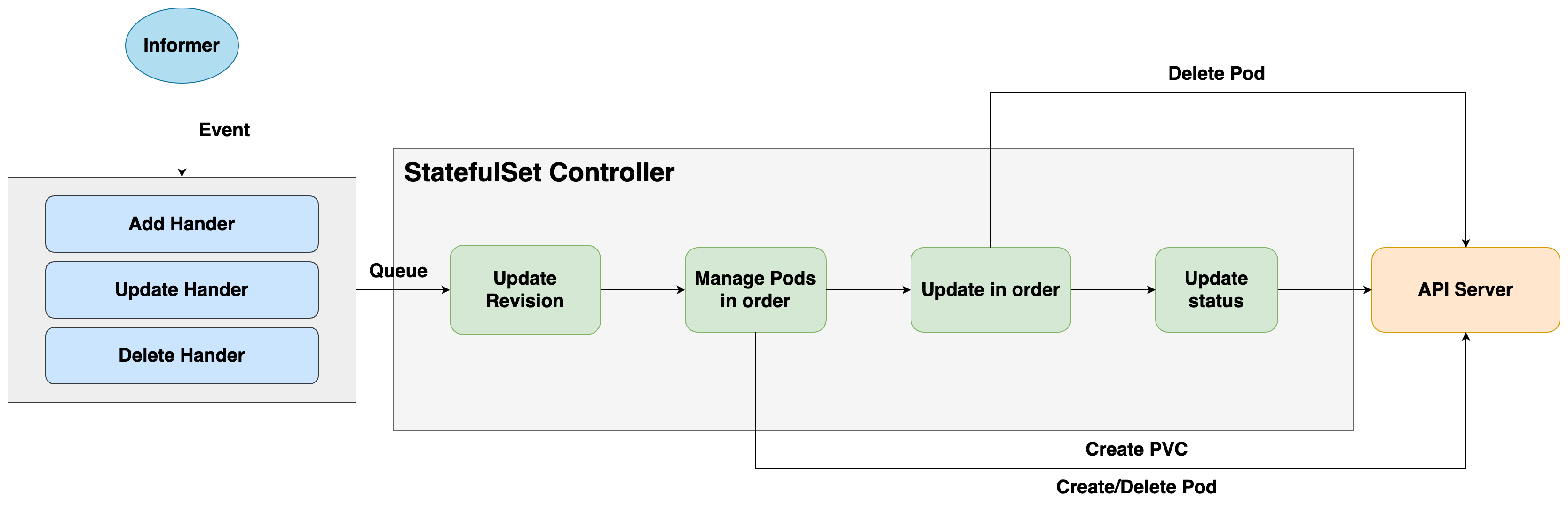 首先通过注册 Informer的 Event Handler(事件处理),来处理 StatefulSet 和 Pod 的变化。在 Controller 逻辑中,每一次收到 StatefulSet 或者是 Pod 的变化,都会找到对应的 StatefulSet 放到队列。紧接着从队列取出来处理后,先做的操作是 Update Revision,也就是先查看当前拿到的 StatefulSet 中的 template,有没有对应的 ControllerRevision。如果没有,说明 template 已经更新过,Controller 就会创建一个新版本的 Revision,也就有了一个新的 ControllerRevision hash 版本号。