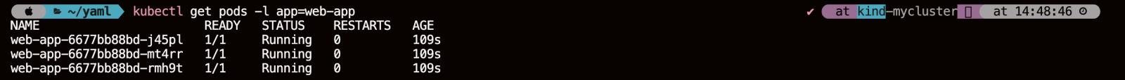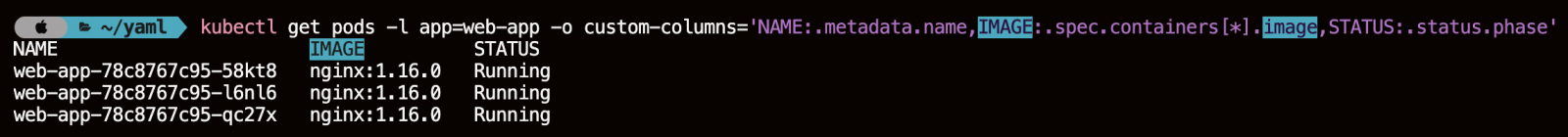 kubectl get pods -l app=web-app -o custom-columns='NAME:.metadata.name,IMAGE:.spec.containers[*].image,STATUS:.status.phase'