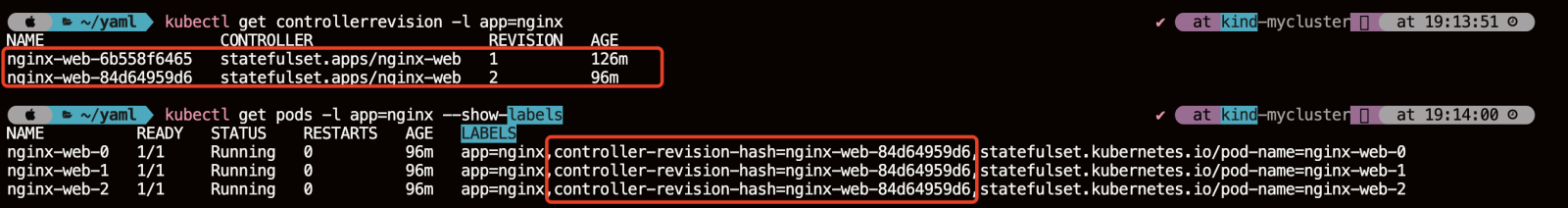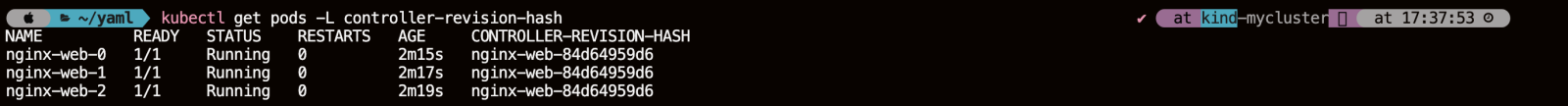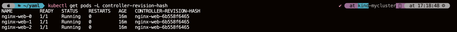 之前我们学到 Deployment 使用 ReplicaSet 来管理 Pod 的版本和所期望的 Pod 数量,但是在 StatefulSet 中,是由 StatefulSet Controller 来管理下属的 Pod,因此 StatefulSet 通过 Pod 的 label 来标识这个 Pod 所属的版本,这里叫 controller-revision-hash。这个 label 标识和 Deployment 以及 StatefulSet 在 Pod 中注入的 Pod template hash 是类似的。