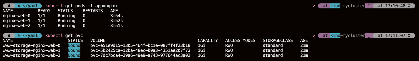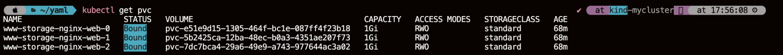 通过 get pvc 可以看到 NAME 那一列名称,前缀为 www-storage,中间是 nginx-web,后缀是一个序号。通过分析可以知道 www-storage 是 volumeClaimTemplates 中定义的 name,中间为 StatefulSet 定义的 name,末尾的序号对应着 Pod 的序号,也就是三个 PVC 分别被三个 Pod 绑定。通过这样一种方式,达到不同的 Pod 享有不同的 PVC;PVC 也会绑定相应的一个 PV, 来达到不同的 Pod 绑定不同 PV 的目的。