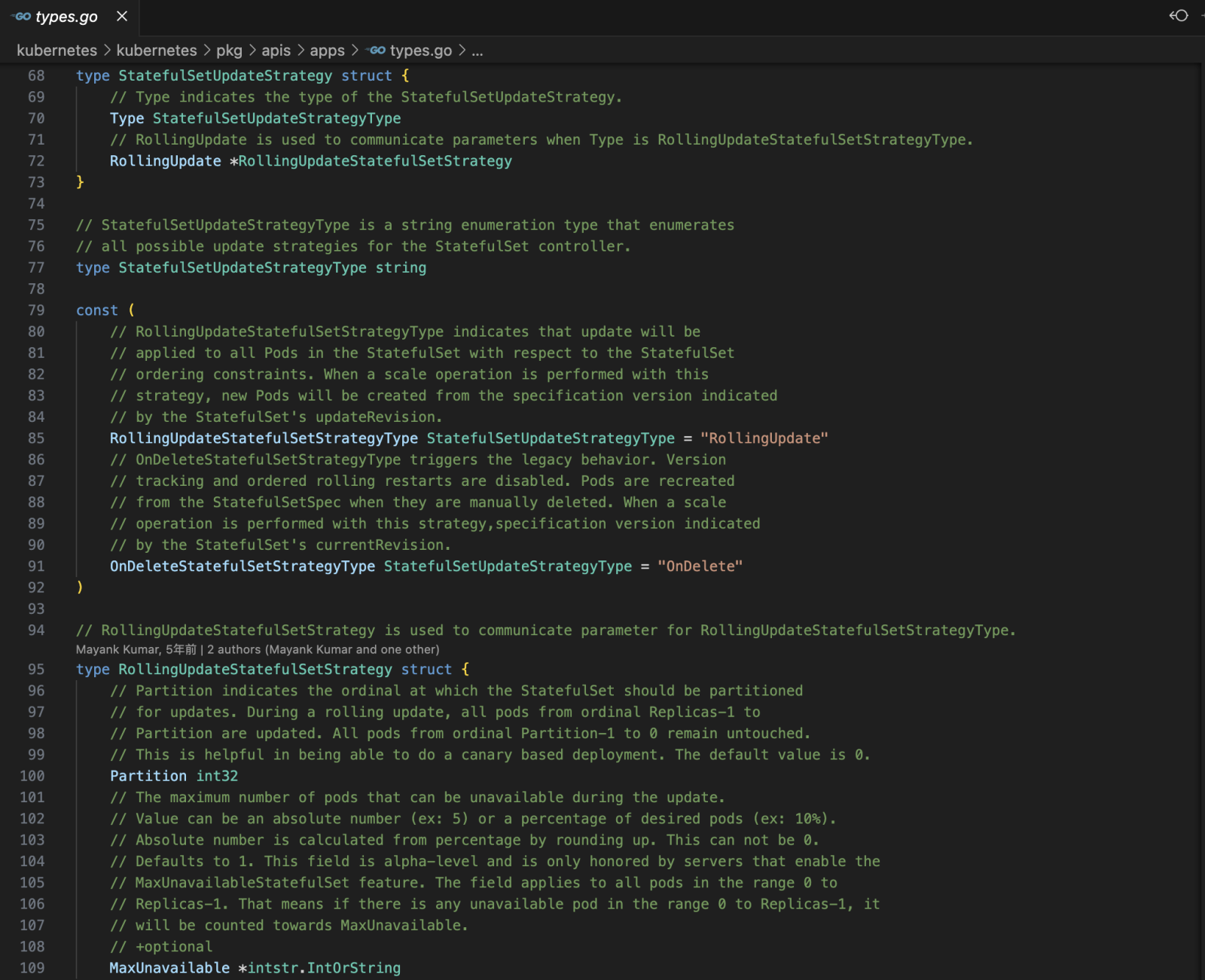 可以看到 StatefulSetUpdateStrategy 有个 type 字段,这个 type 定义了两个类型:一个是 RollingUpdate;一个是 OnDelete。