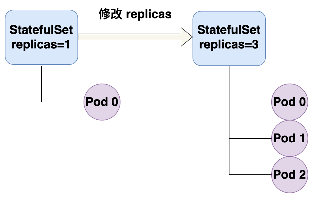 假设 StatefulSet 初始配置 replicas 为 1,有一个 Pod0。那么将 replicas 从 1 修改到 3 之后,其实我们是先创建 Pod1,默认情况是等待 Pod1 状态 READY 之后,再创建 Pod2。