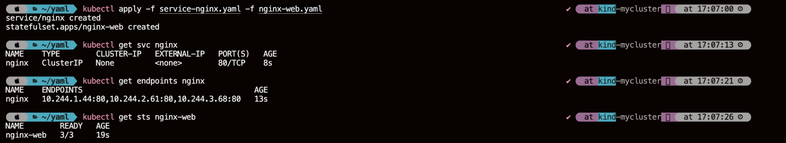 最后通过 get sts (StatefulSet 缩写) nginx-web。从结果可以看到有一列 READY,值为 3/3。分母 3 是 StatefulSet 中期望的数量,而分子 3 表示 Pod 已经达到期望 READY 的状态数量。