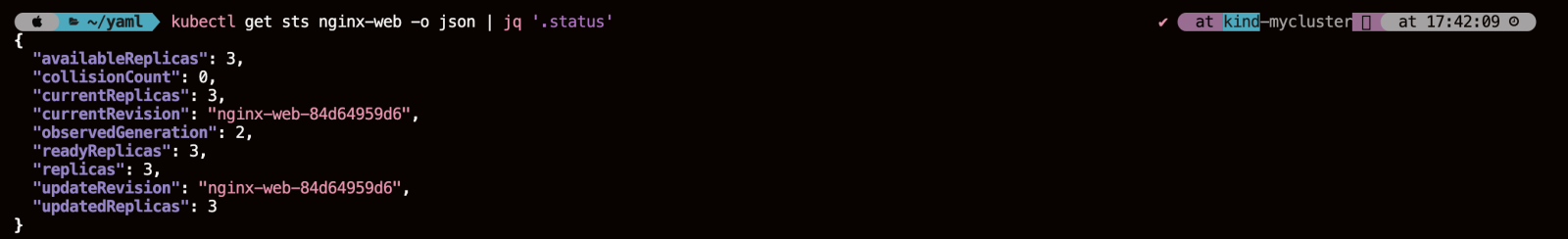 当然这里也能看到 currentReplica 和 updateReplica,以及 currentRevision 和 updateRevision 都是一样的,这就表示所有 Pod 已经升级到了所需要的版本。