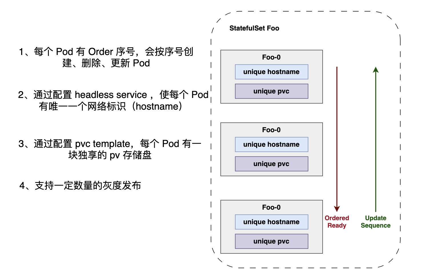 - 首先,每个 Pod 会有 Order 序号,会按照序号来创建,删除和更新 Pod;