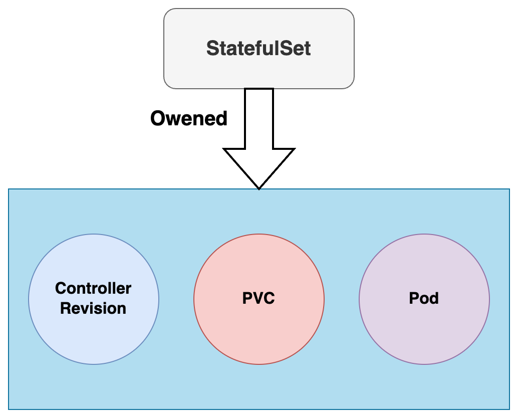 这里不同的地方在于,当前版本的 StatefulSet 只会在 ControllerRevision 和 Pod 中添加 OwnerReference,而不会在 PVC 中添加 OwnerReference。拥有 OwnerReference 的资源,在管理的这个资源进行删除的默认情况下,会关联级联删除下属资源。因此默认情况下删除 StatefulSet 之后,StatefulSet 创建的 ControllerRevision 和 Pod 都会被删除,但是 PVC 因为没有写入 OwnerReference,PVC 并不会被级联删除。