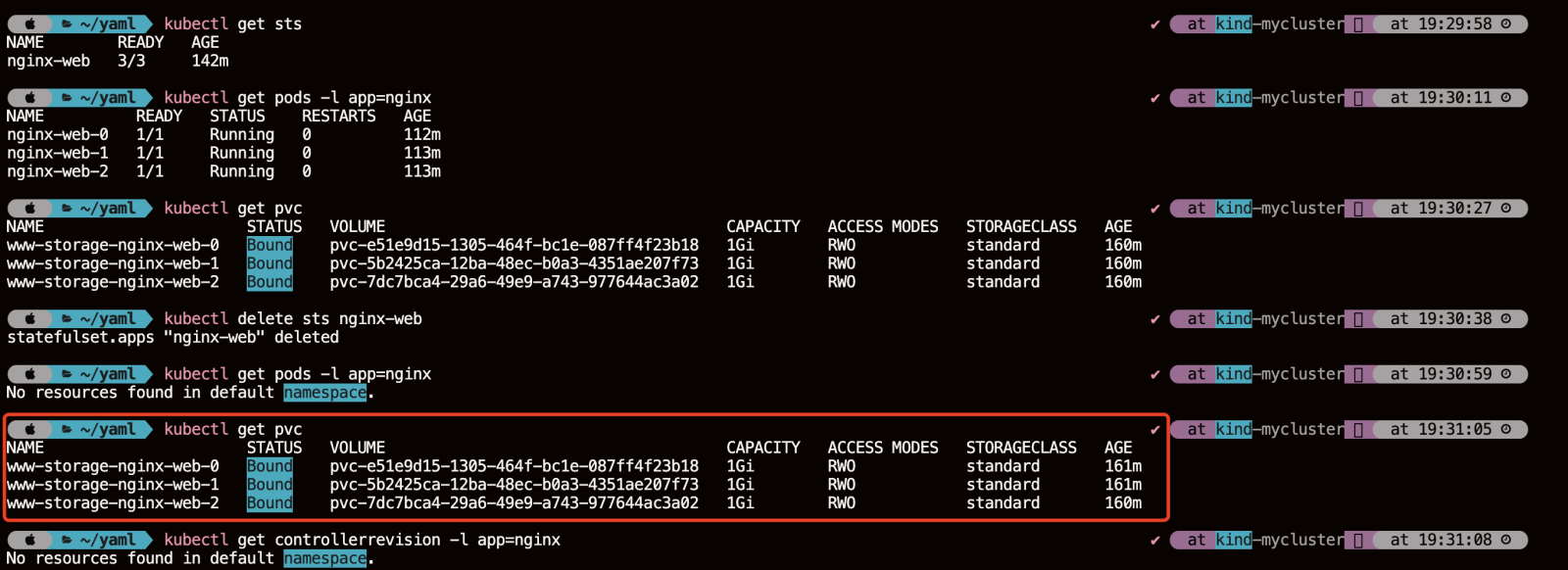 可以看到由 StatefulSet 创建的 ControllerRevision、Pod 均被删除,但是 PVC 未被删除