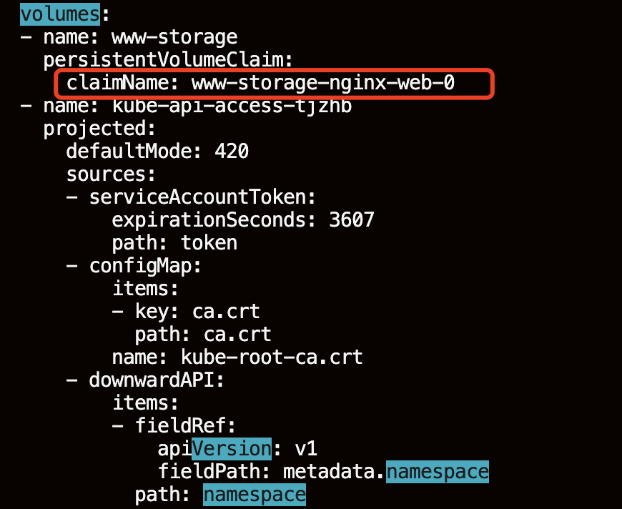 或者可以查看其中的某一个 Pod,这个 Pod 里面同样有个声明的 volumes,这个 persistentVolumeClaim 里的名称 www-storage-nginx-web-0,对应着 PVC 列表中看到的序号为 0 的 PVC,之前是被旧的 Pod 所使用。升级过程中 Controller 删除旧 Pod,并且创建了一个同名的新 Pod,新的 Pod 仍然复用了旧 Pod 所使用的 PVC。