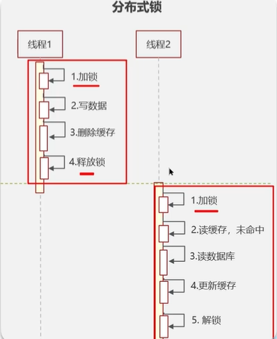 互斥锁文字描述:线程1请求查询,在redis中未查询到缓存数据,于是获取互斥锁,查询数据库重建缓存数据,写入缓存,释放锁;线程1进行的同时线程2也请求查询未命中,于是获取互斥锁但失败了,只能休眠会再一直重试到缓存命中。