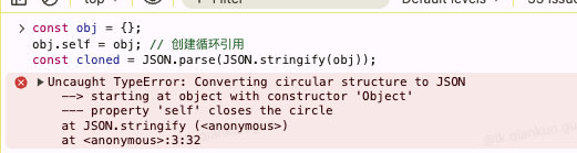 如果对象中存在循环引用,调用 JSON.stringify 会抛出错误,导致克隆失败