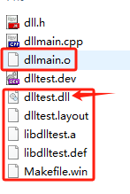 点击编译后,我们可以在项目文件夹中,看到dlltest.dll,这就是我们需要的目标动态链接库。libdlltest.a则是vc里需要用到的lib文件。